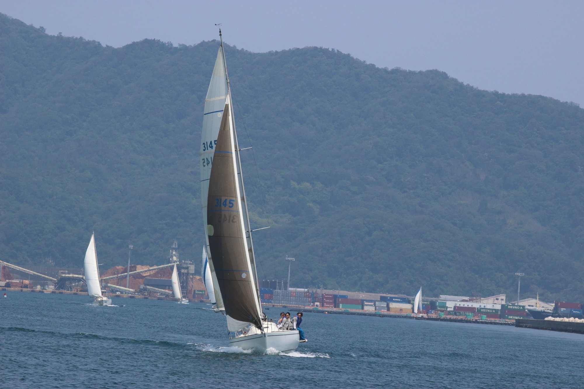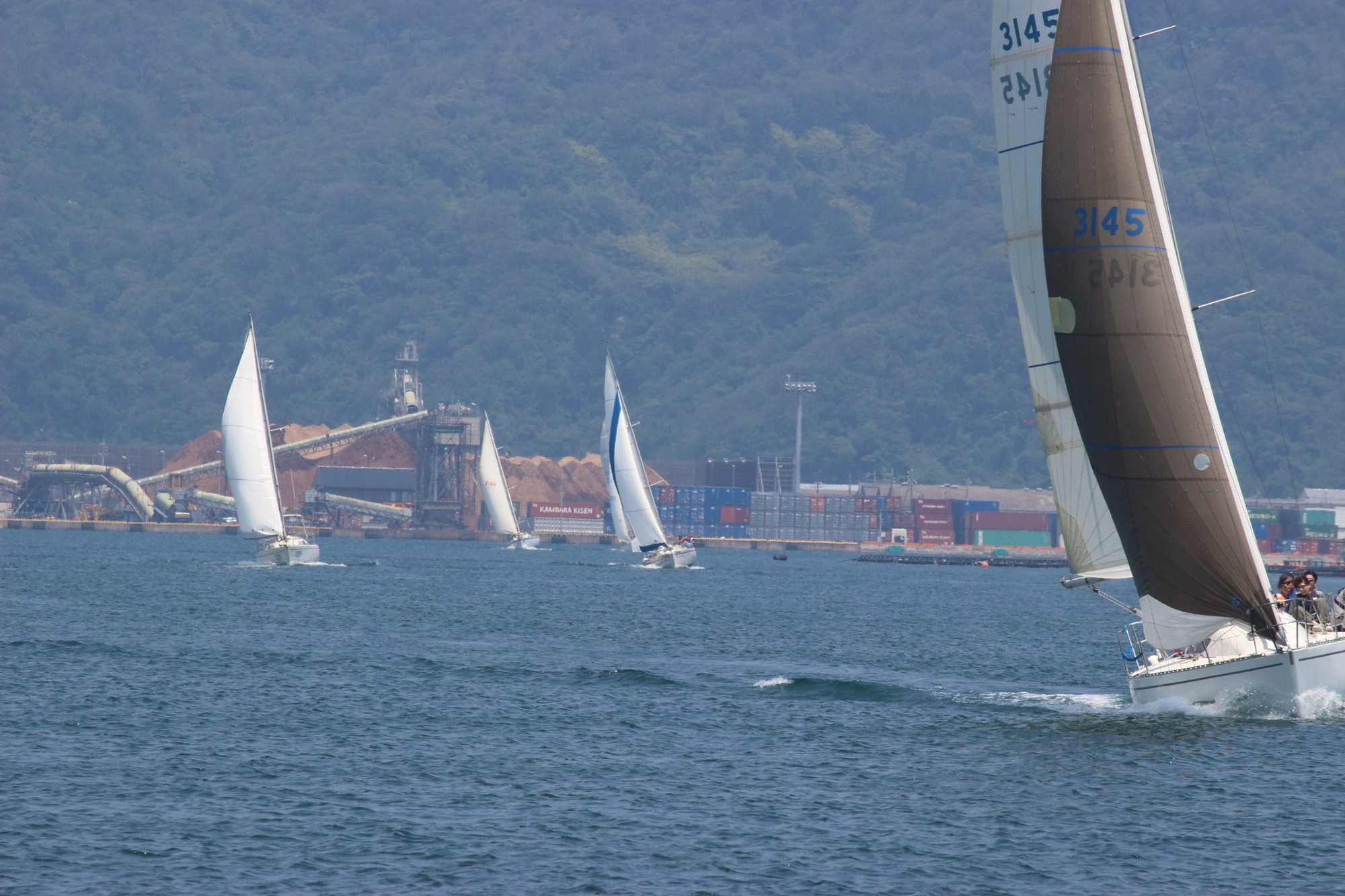 スタートで、ジブファーラーリリースの時シートがキンクしてしまい、もたもたして、ジャストスタートを逃しましたが、無事スタート!