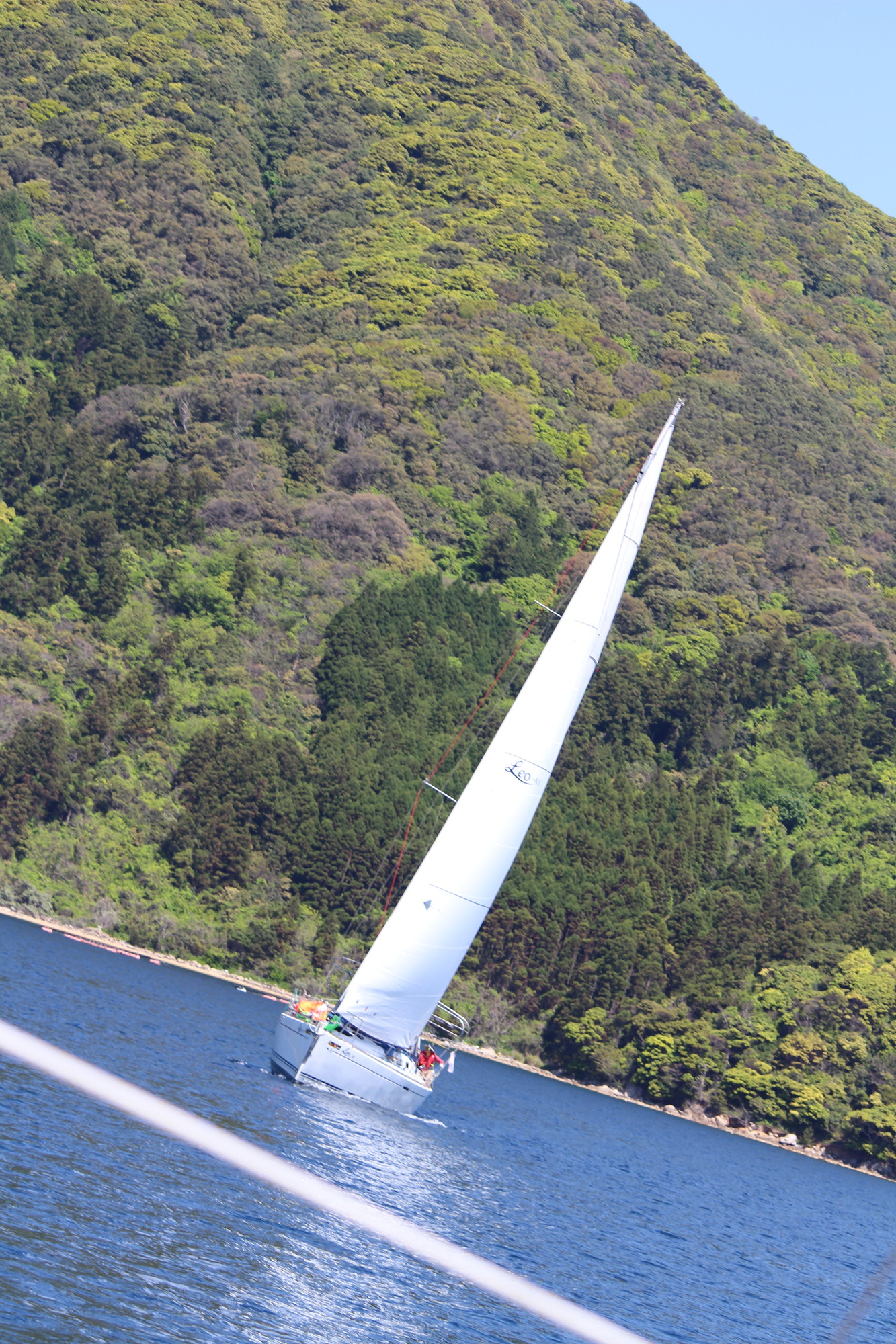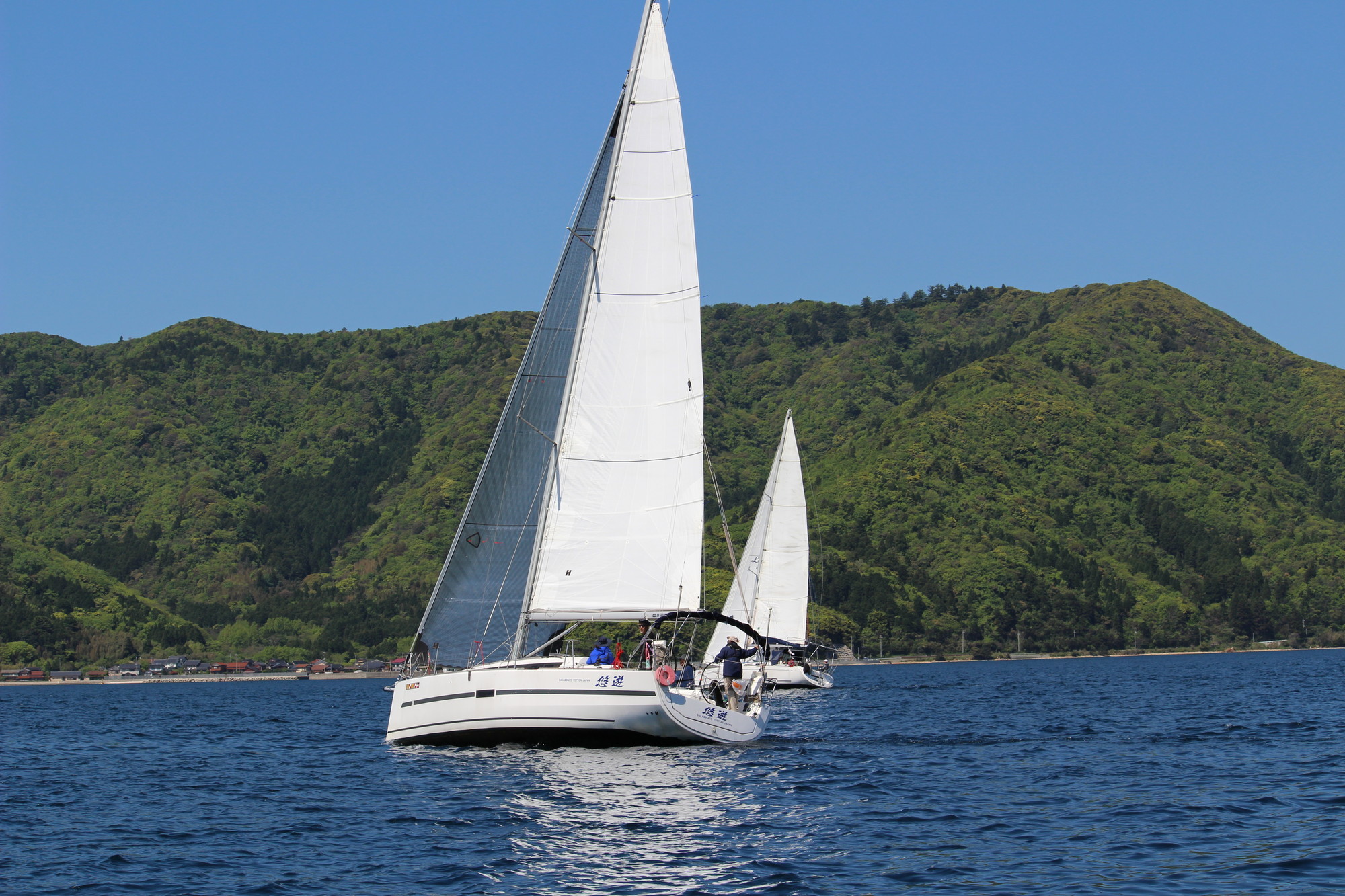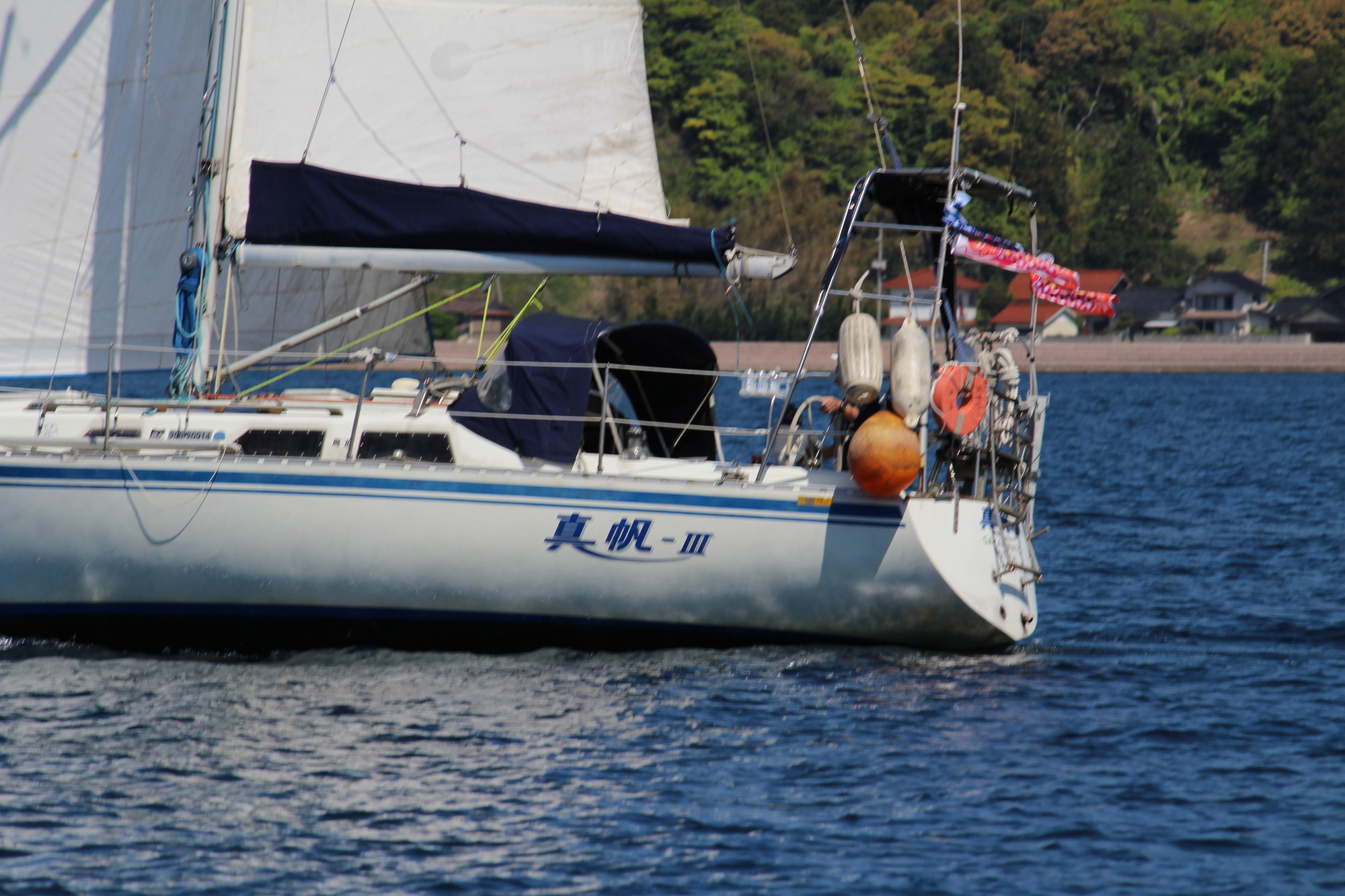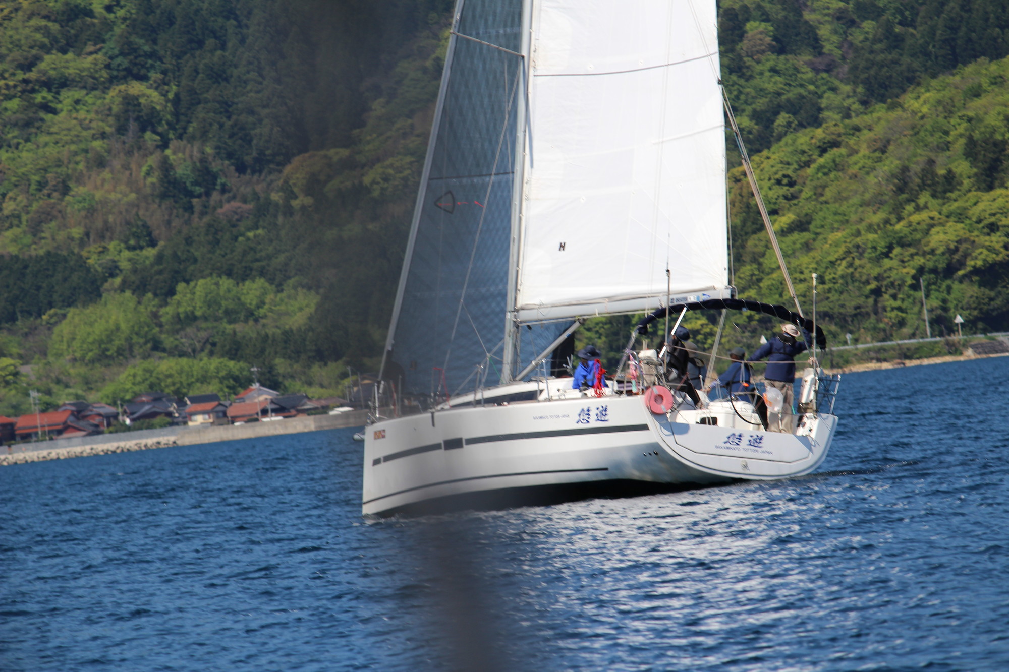 浦郷湾深くゼネカーで入り、ジャイブの為ジブを展開し、ゼネカーをダウン!