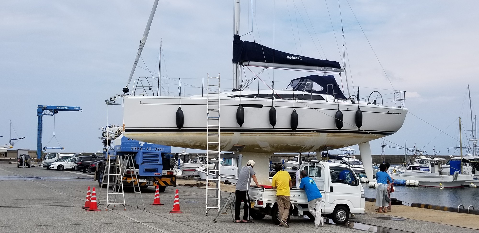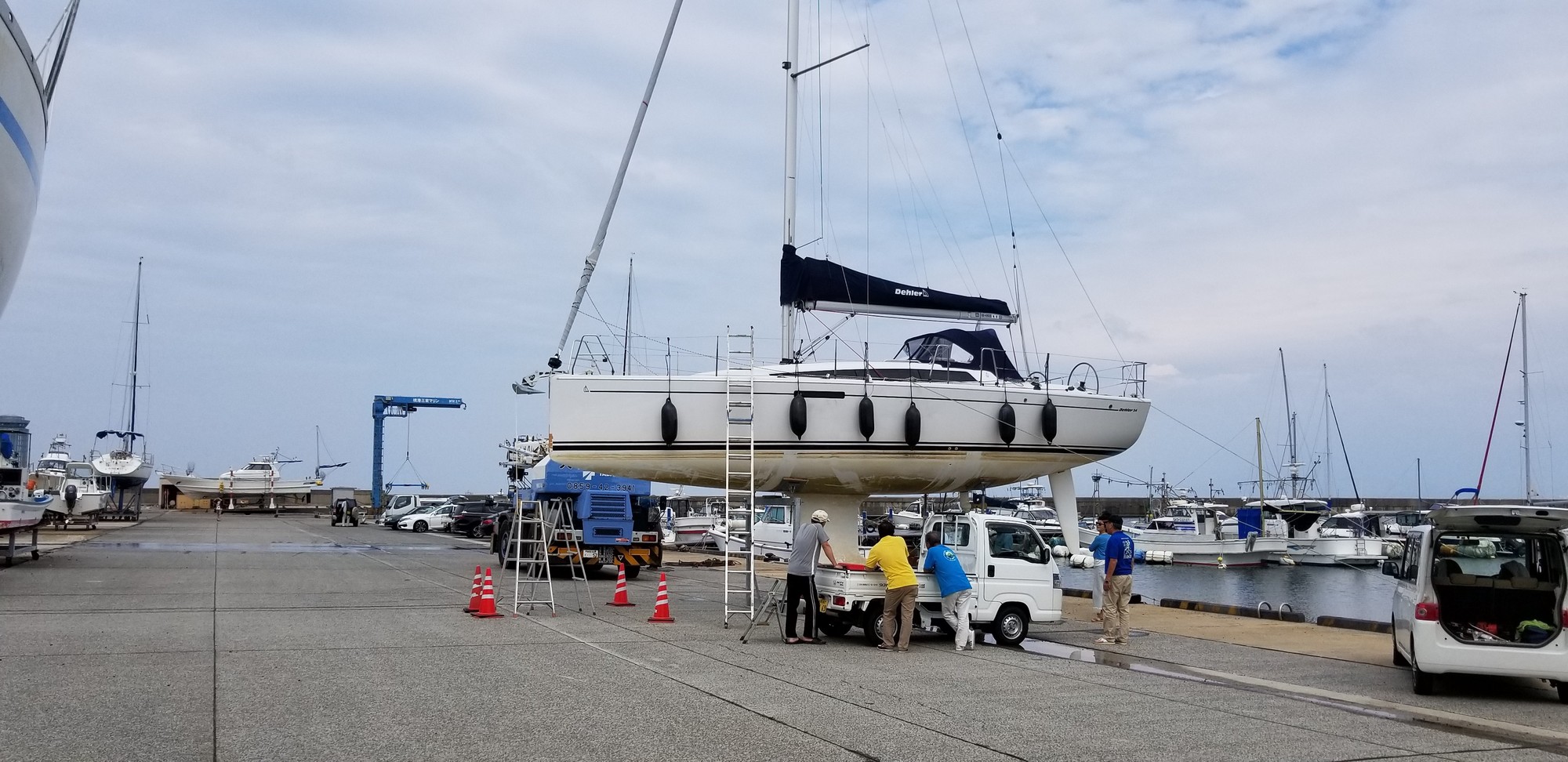 今日6月23日(土)午前中からメイプルのクルー兼NISSAN30 Proto Type のオーナーに頼まれ、船台を一時的に別の艇(回航したDehler34)が修理の為使用するので下架作業をした。