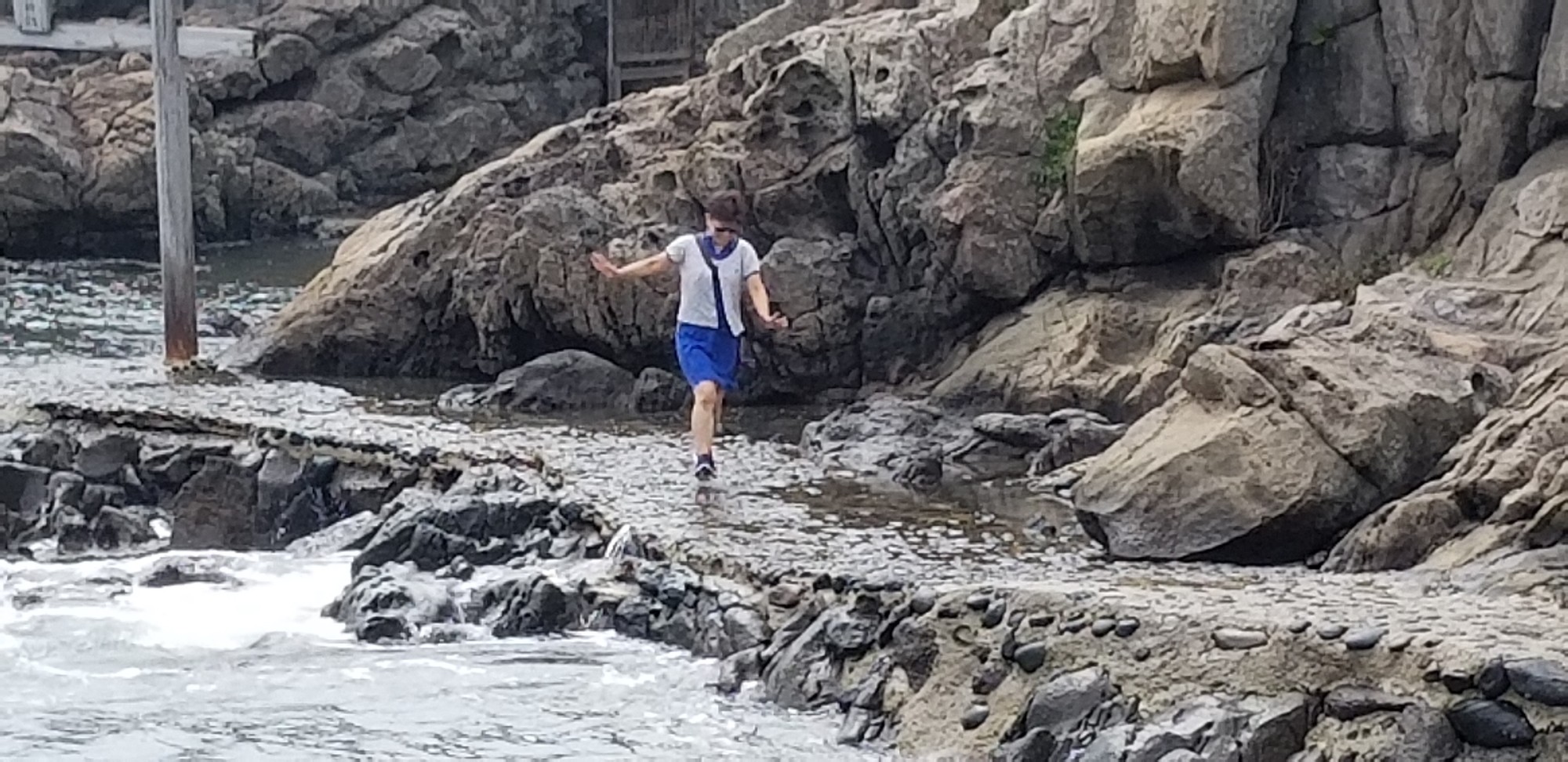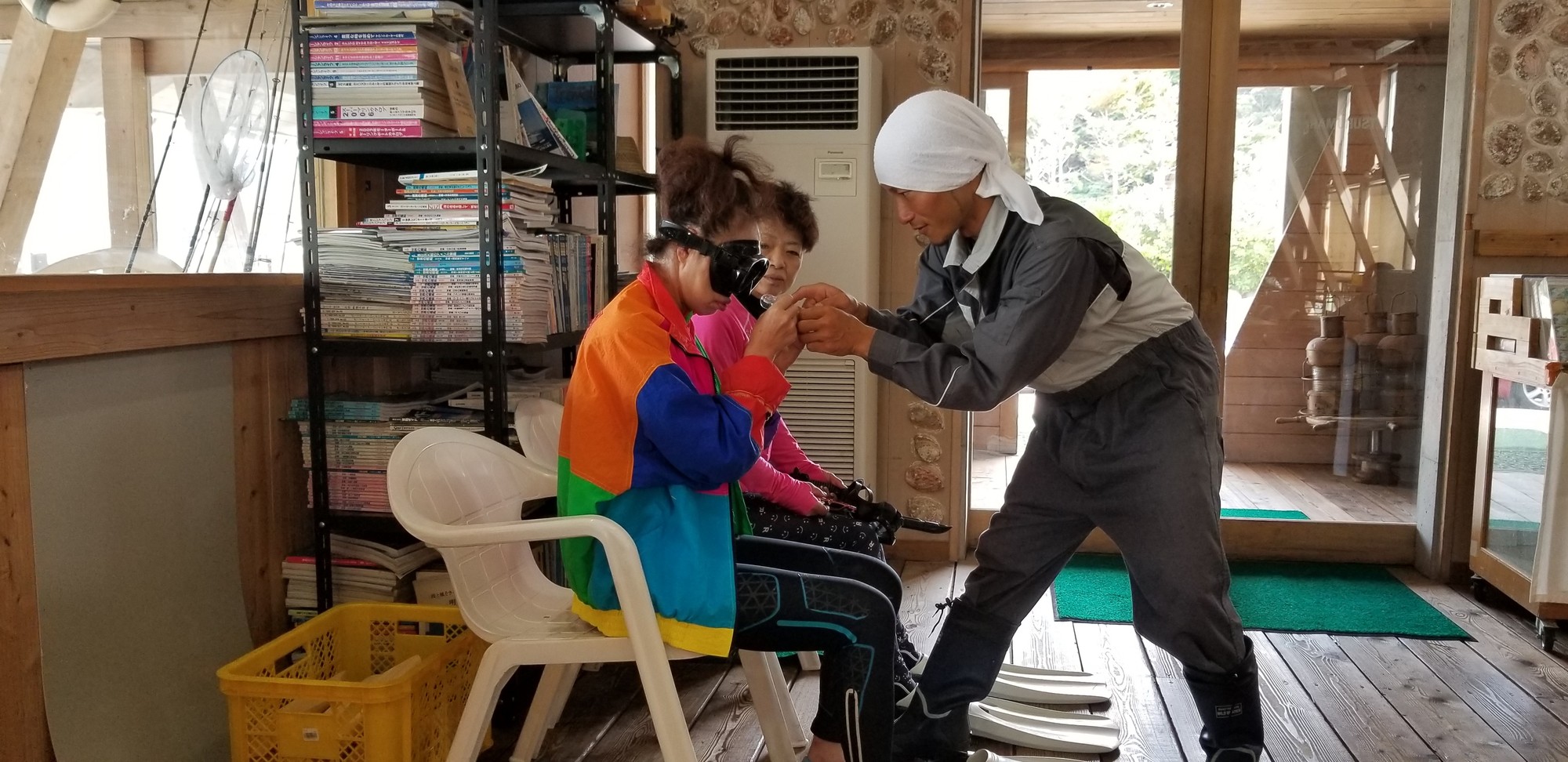 翌日、シュノーケリングの支度をして貰い、国賀海岸を船から観覧し、少し荒れ気味だったので、無難なシュノーケリングスポットに行く。