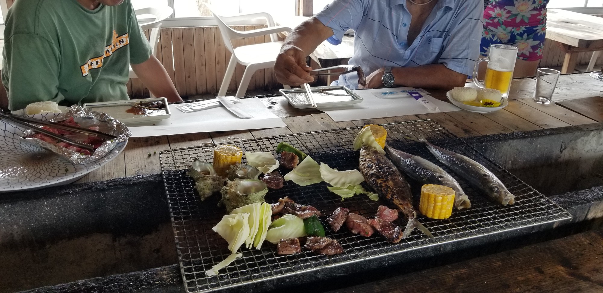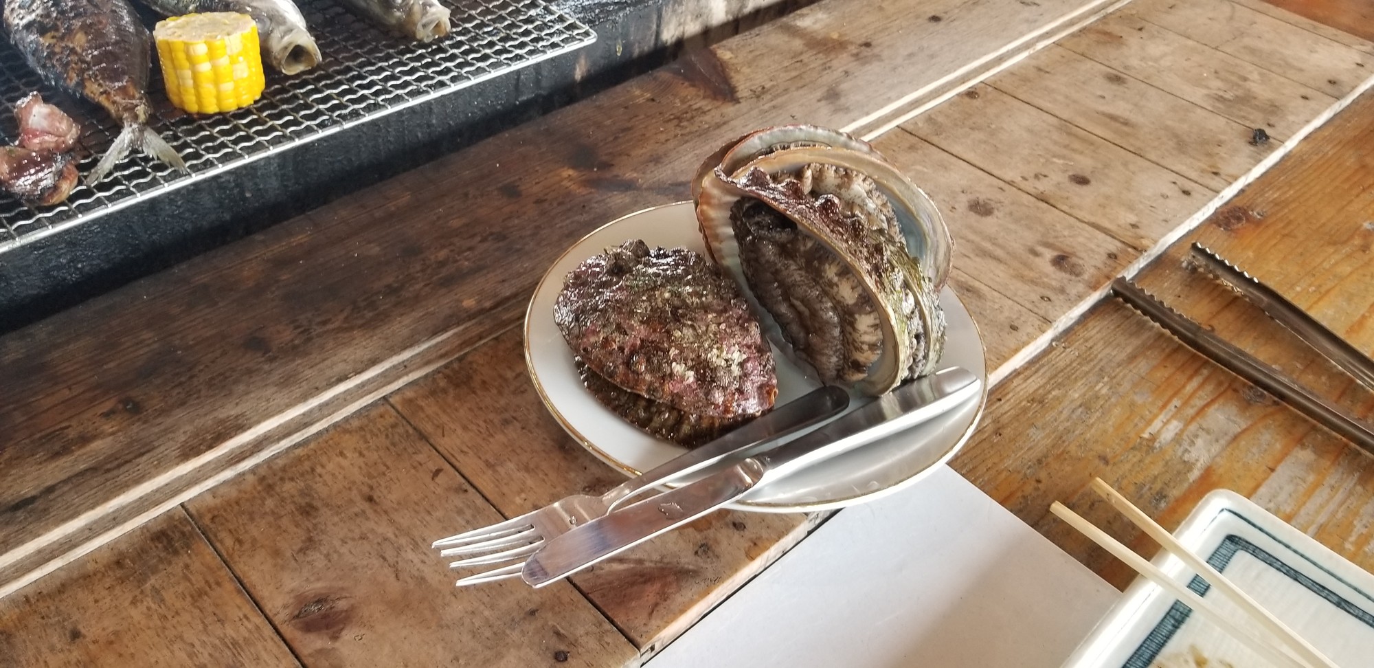 昼食はホテルのバーベキューハウスで、BBQをして海鮮物や野菜更に牛肉、そして鮑の地獄焼き!一人一枚づつ食して大満足!