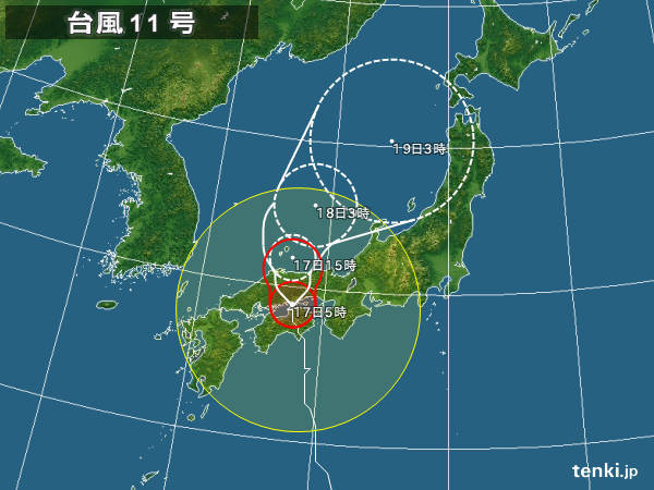 台風11号山陰地方に接近中! 17日から18日に掛けてもっとも米子、境港地域に大接近の予報! 19日には日本海のど真ん中に台風の中心が移動の予報! 19日朝今には暴風域を外れてくれると良いのだが、今のところ成り行きを見守るしかない。 この天気図はtenki.jpから転載しています。 1230 1231 1232
