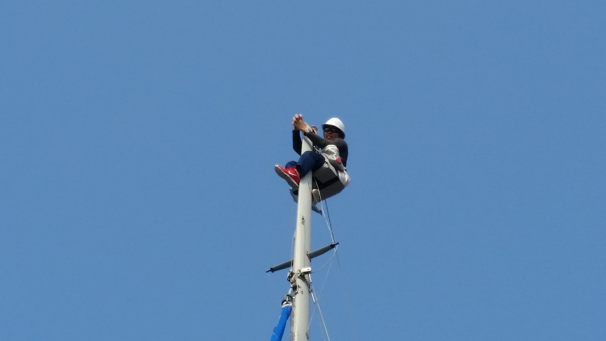 まずは技術系のエンジニアにボースンチアーでマストトップ迄吊り上げの作業を!
